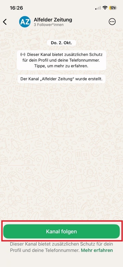 Andere Nutzerinnen und Nutzer können nicht sehen, wer den Kanal abonniert hat, auch nicht die Inhaberinnen und Inhaber des Kanals. Die Nummer, mit der Sie registriert sind, ist also geschützt. Die Beiträge im Kanal werden nach 30 Tagen gelöscht.