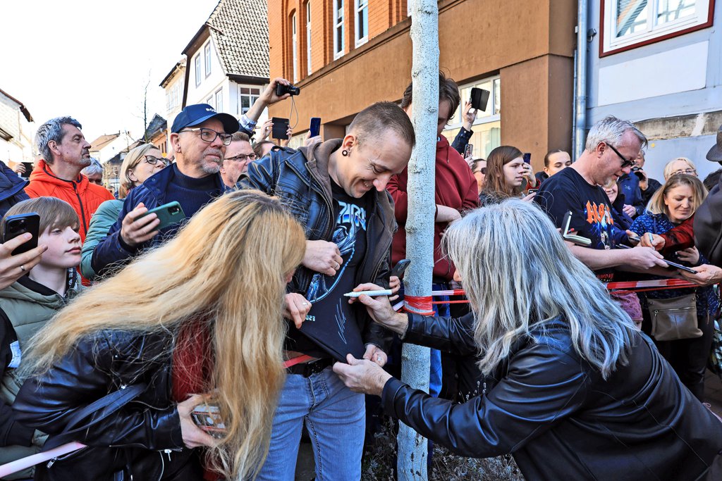 11.04 Uhr. Brunhilde Bosse wartet wie viele andere am mit rot-weißem Band abgesperrten Rathaus auf ihre Idole. Die 86-Jährige ist mit einem Rollator gekommen. „Ich kenne die Frau von Klaus Meine. Gabi arbeitete mit mir im Büro einer Versicherung in Hannover“, erzählt die Frau aus Sarstedt, die noch Schallplatten der Scorpions hat. Und klar, sie würde auch mit Rollator zum Konzert ihrer Rocker gehen. Ein paar Meter weiter warten die Sarstedter Bierfreunde mit selbstgebrautem Fassbier auf die Stars. Auch sie: Fans. „Wind of Change“ hören sie besonders gern. Die junge „Empfangs-Band“ 4 Hugs ist ebenfalls schon angerückt.