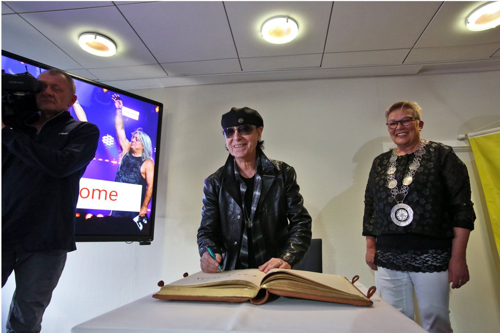 Die Band trägt sich ins Goldene Buch der Stadt ein, Bürgermeisterin Heike Brennecke hält eine Rede zu Ehren der Band und ist dabei ergriffen. Ausführlich und lebendig breitet sie die lange Geschichte der Formation aus – was die Rocker sehr freut.