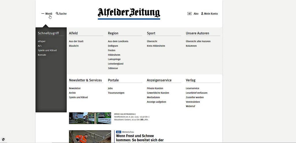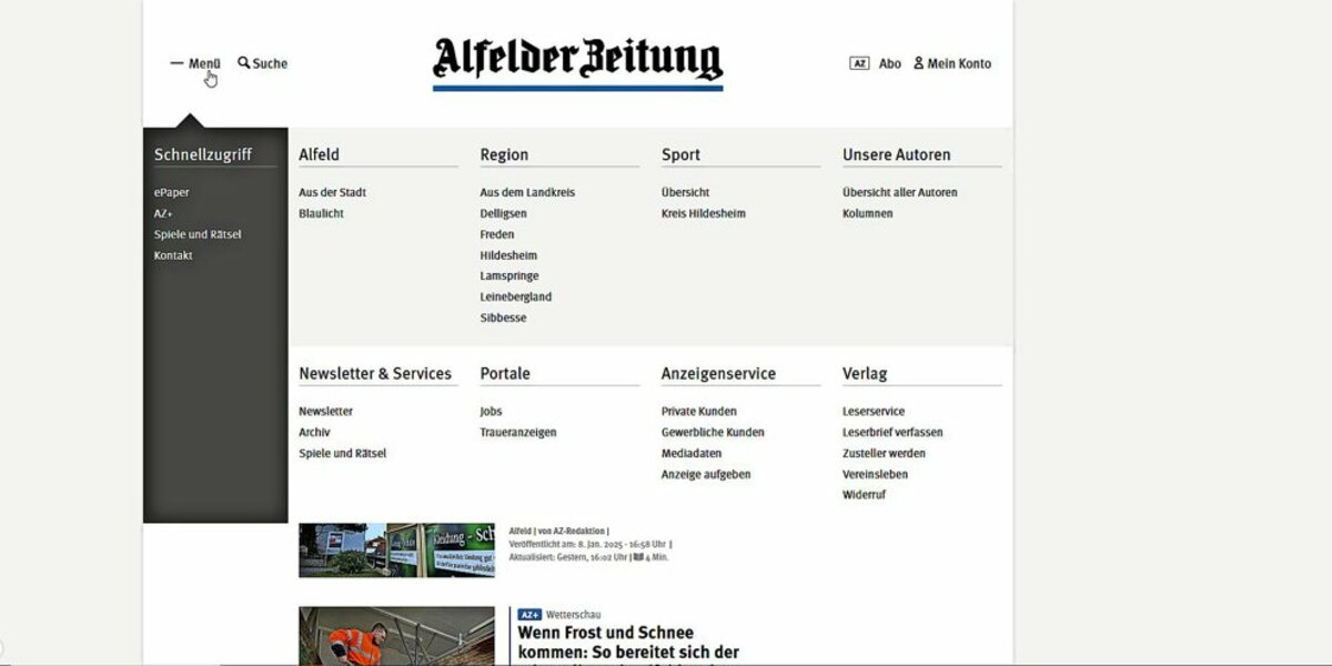 Mit nur einem Klick zum Überblick: Unter dem Reiter „Menü“ finden Sie eine Übersicht der gesamten Webseite. Hier geht es sowohl direkt zum ePaper, als auch zu den Rätseln und AZ+. Sie können sich zudem Ihre Nachrichten auswählen: Lassen Sie sich beispielsweise alles Wichtige aus Alfeld, Freden, Delligsen oder aus dem Landkreis Hildesheim anzeigen.
