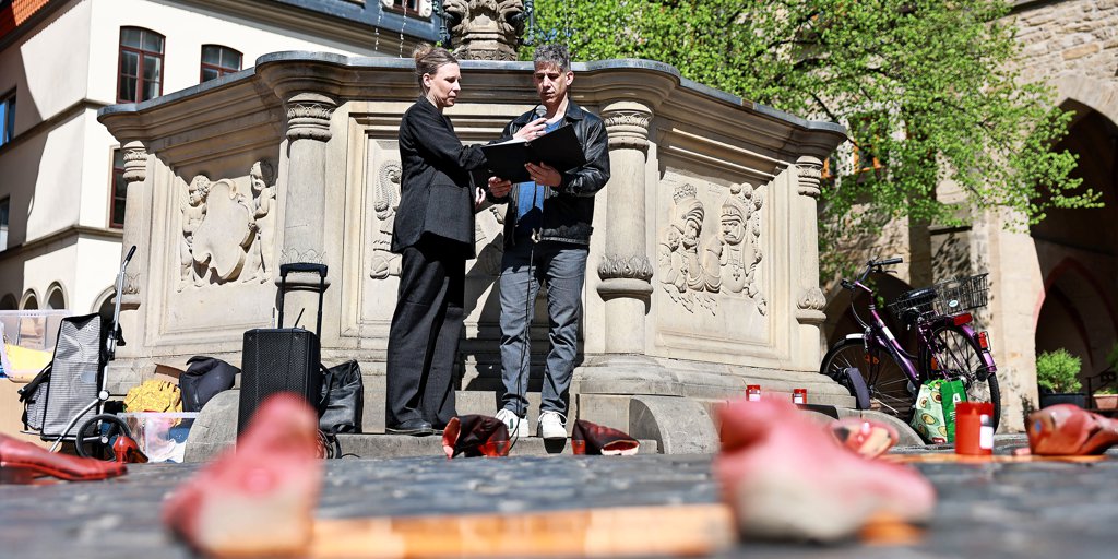 Lesung vor roten Schuhen auf dem Hildesheimer Marktplatz: Linda Riebau und Manuel Klein. Foto: Julia Moras