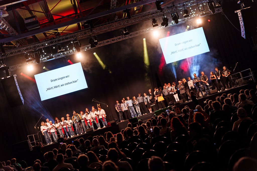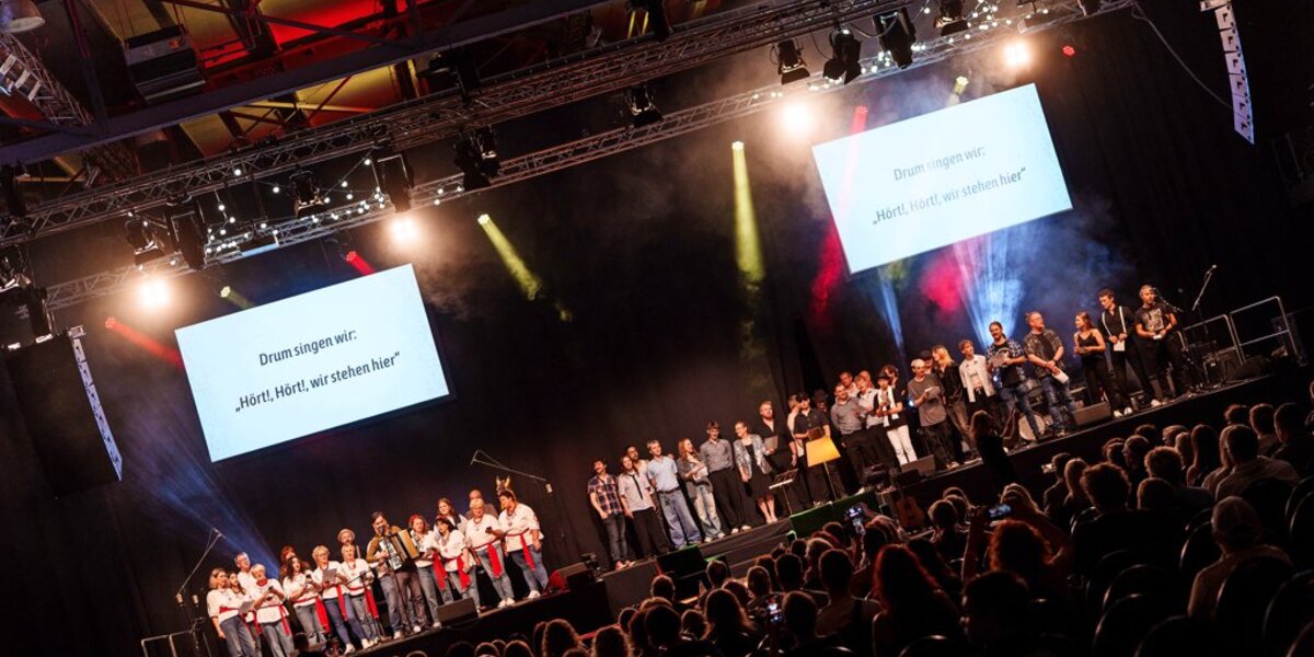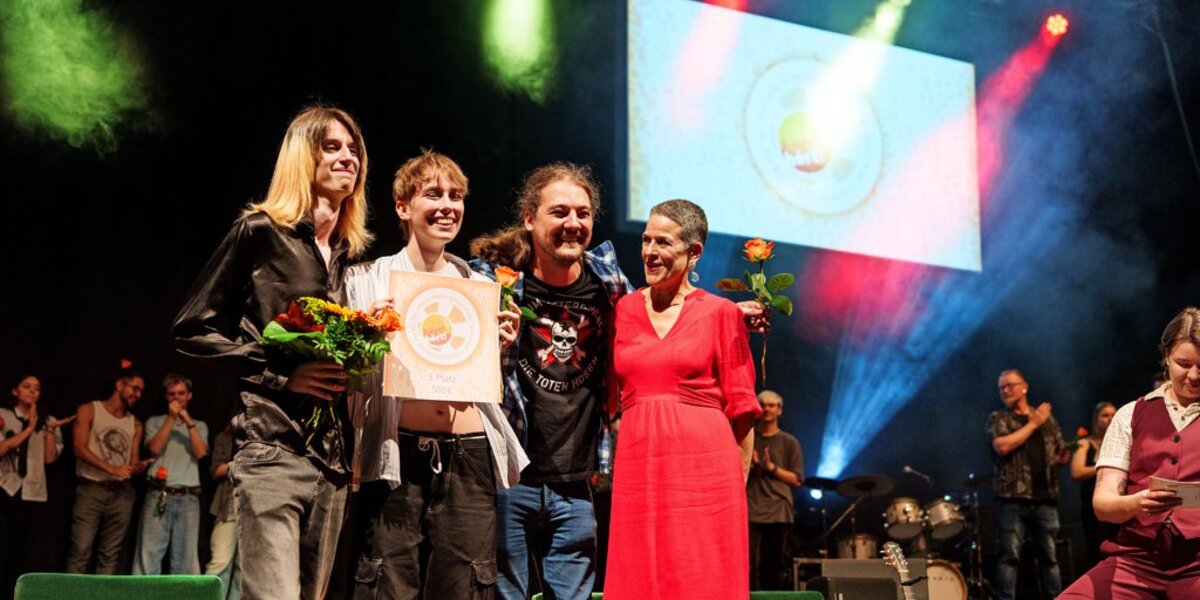 Zu den Klängen von „Mambo No. 5“ tanzen Kaja Stürmer und Max Hannappel auf die Bühne. Die beiden haben schon zusammen Musik gemacht, Stürmer 2017 die zweite Ausgabe von „hört! hört!“ sogar gewonnen. Jetzt ist sie als Projektassistenz dabei, ihre damalige Duett-Partnerin Sarah Haase sitzt dieses Mal in der Fachjury. Nach all den Jahren ist eine Gemeinschaft um „hört! hört!“ entstanden, die ihre Erfahrungen in dem Projekt auch anderen ermöglichen wollen.