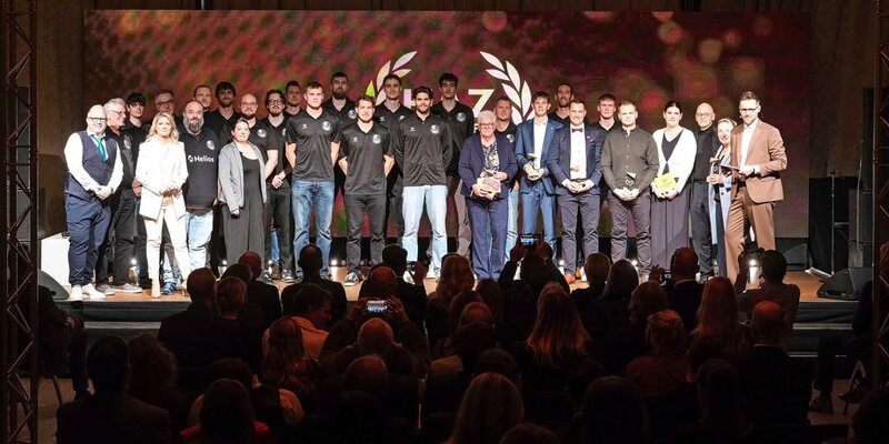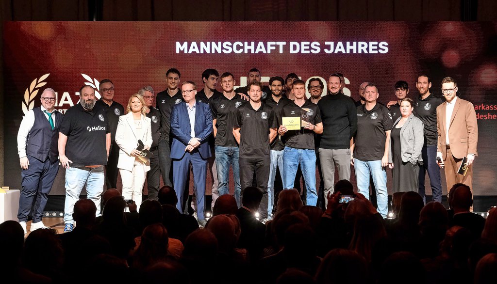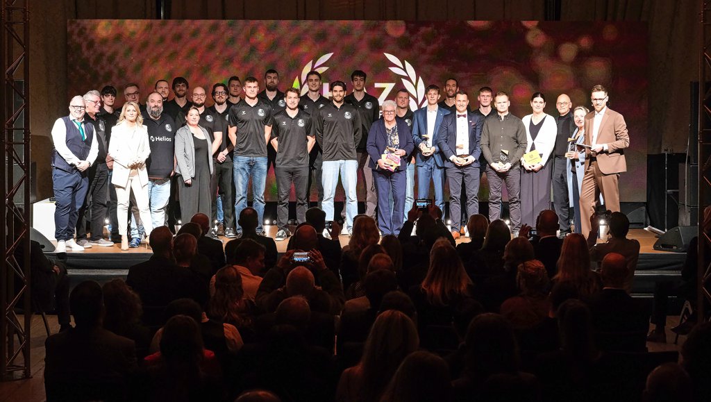 Von den Giesener Volleyballern kam das gesamte Team auf die Bühne. Spieler, Trainer und weitere Vereinsmitglieder waren vor Ort.