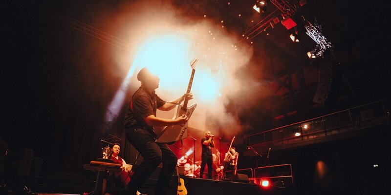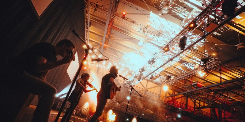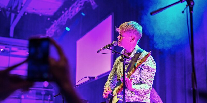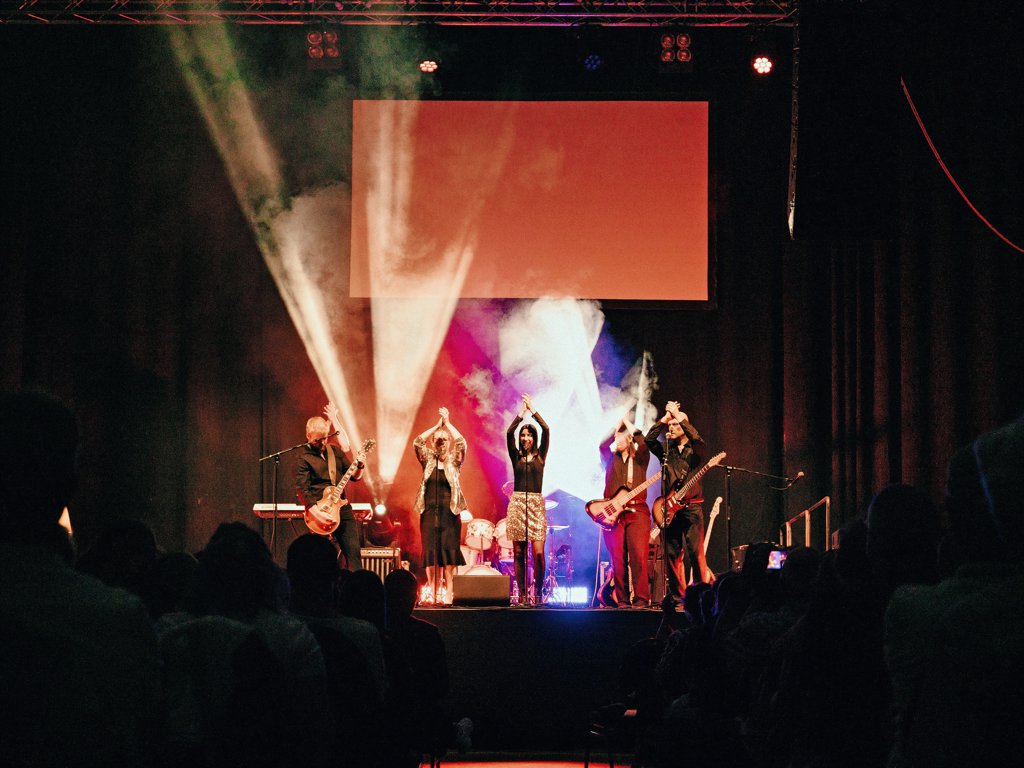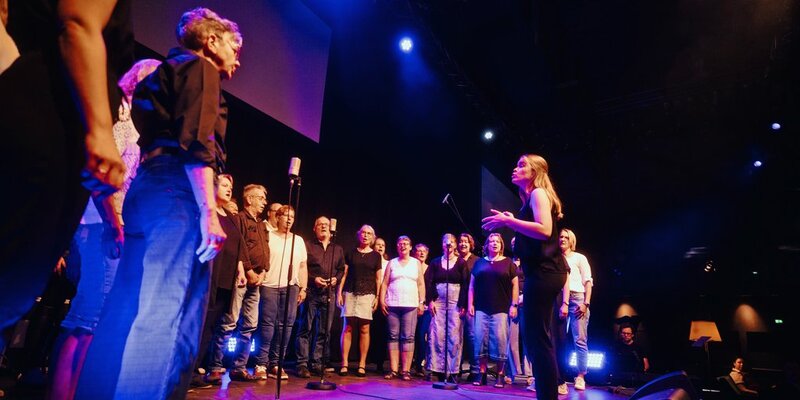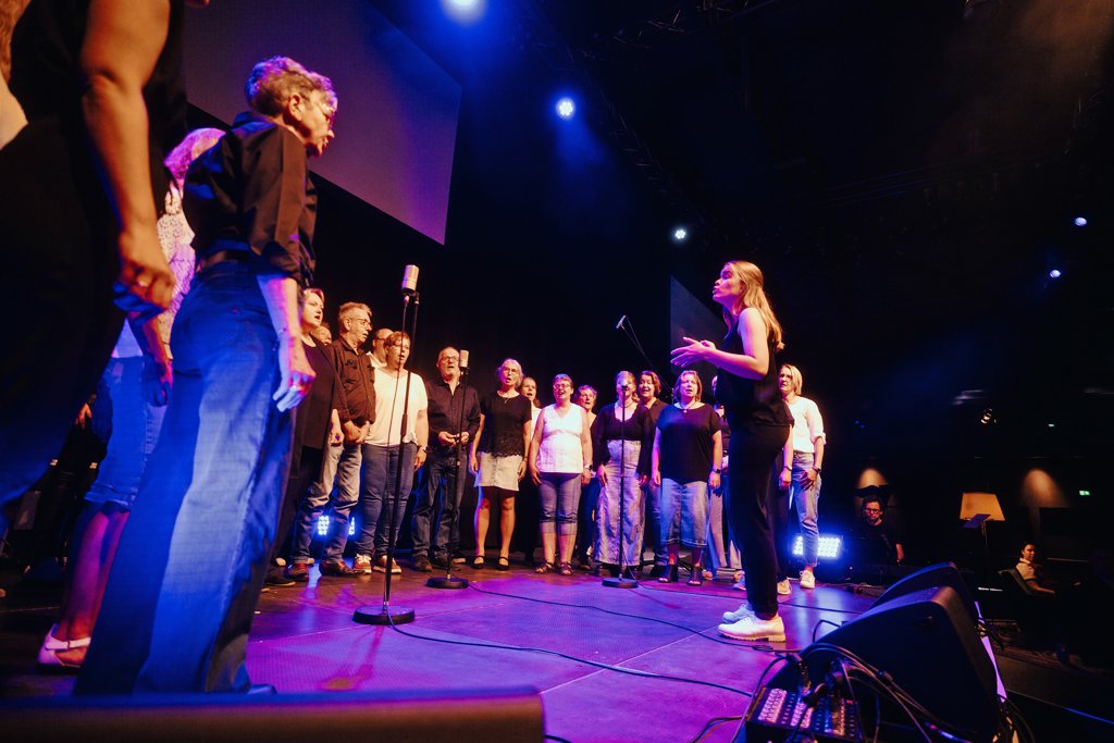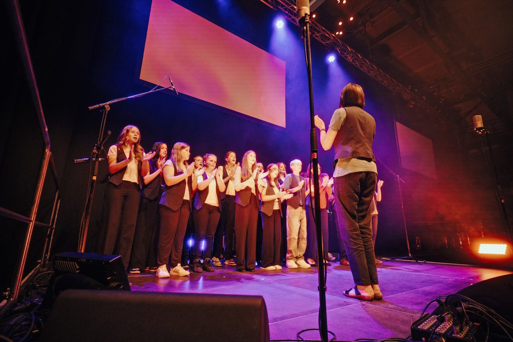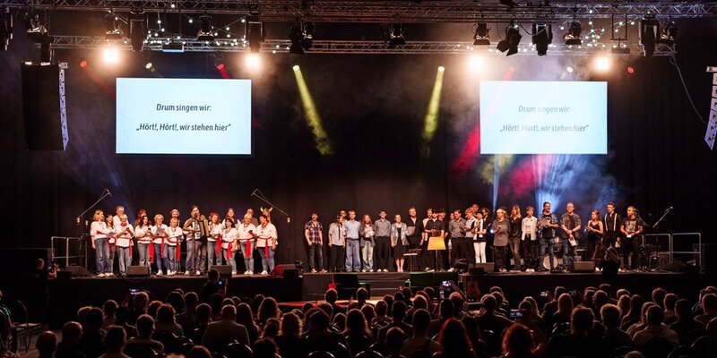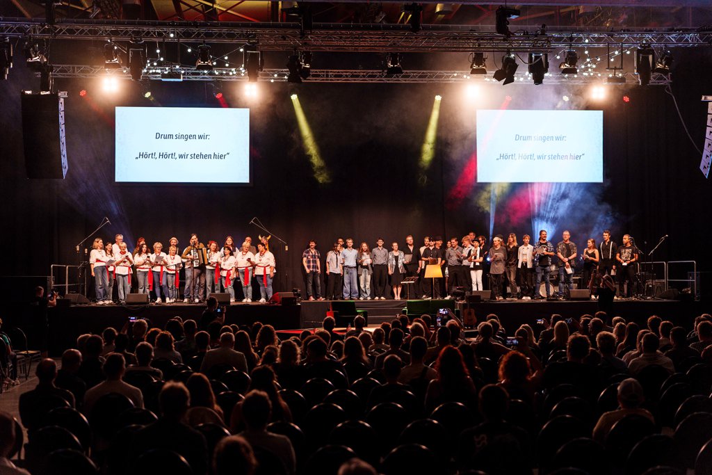 14 Gemeinden haben sich dieses Jahr am Finale von „hört! hört!“ beteiligt. Auf der Bühne haben sich Solo-Sängerinnen und Instrumentalisten, Bands und Chöre präsentiert. Zum Abschluss haben sich alle Musikerinnen und Musiker auf der Bühne in der Halle 39 versammelt. Eine umgedichtete Version von „Falling in Love“ war die große Karaoke-Hymne. (Foto: Clemens Heidrich)