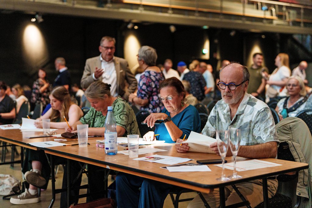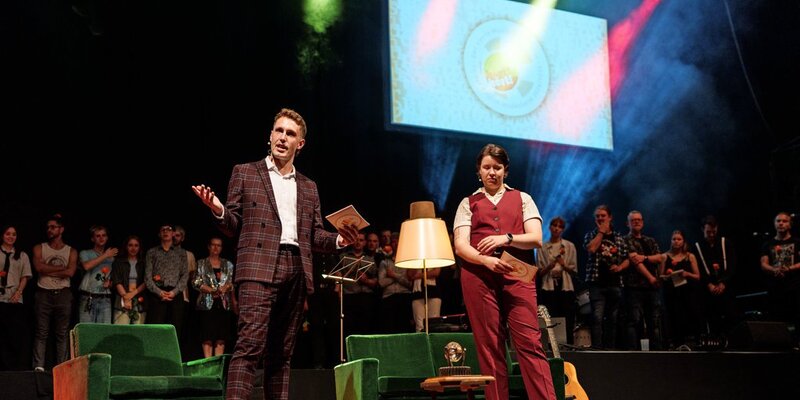 Während die Stimmen ausgezählt werden, lädt Gregor Pellacini alle Teilnehmenden und das Publikum zum Singen ein. Er hat dafür „Can’t Help Falling in Love“ von Elvis zur „hört! hört!“-Hymne umgedichtet. (Foto: Clemens Heidrich)