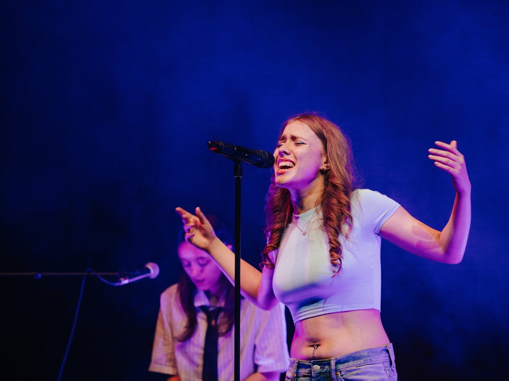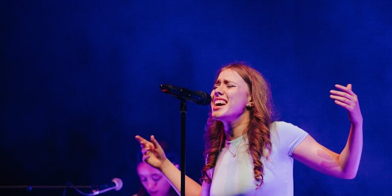Rebecca Heilmeyer von Nova Experience gibt für „Creep“ von Radiohead alles. Die Band aus Nordstemmen – zu der noch gehören: Fine Waldraff am Piano (im Hintergrund) sowie Fernando Oliveira Aargau an den Drums und Marvin Aland an der Gitarre – schafft es damit sogar auf den vierten Platz beim Finale. (Foto: Till Schellenberger)
