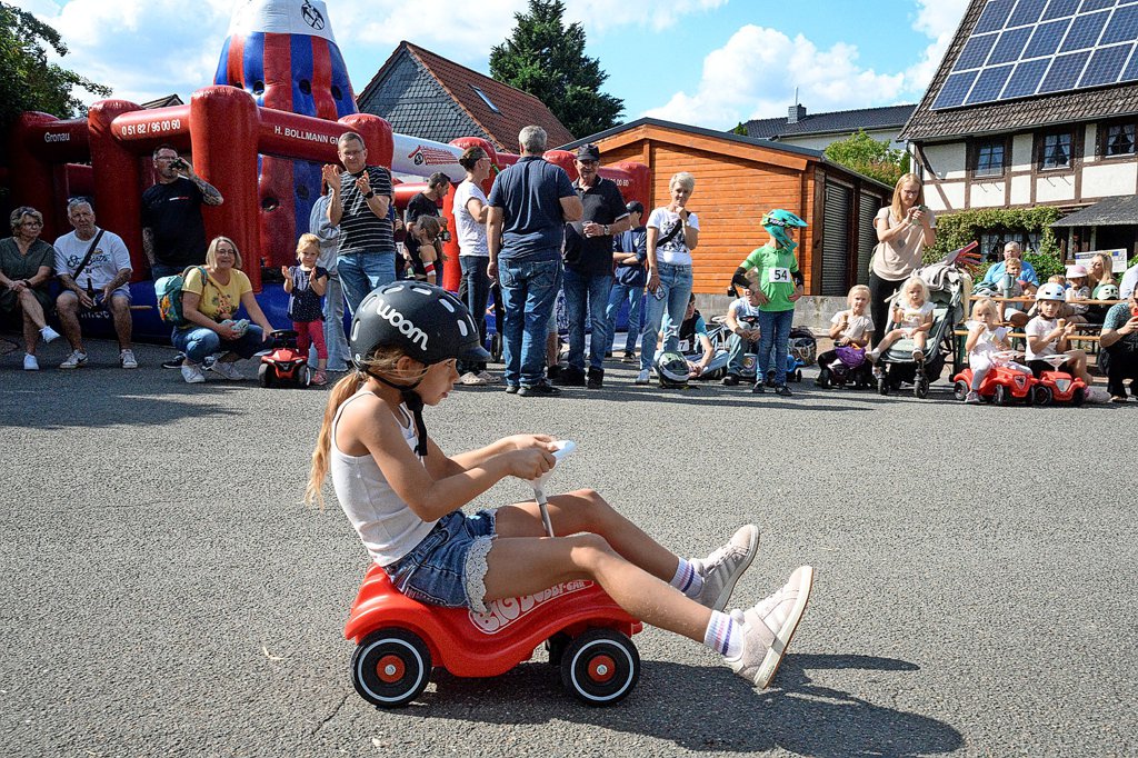 Im zweiten Anlauf lief dann alles glatt. Beide kamen im Ziel an, Abbetmeyer hatte die Nase vorn. Damit war er weiter im Rennen um den Sieg beim zweiten Bobbycar-Rennen, das wieder von zahlreichen Bürgerinnen und Bürgern besucht wurde. Insgesamt gingen 42 kleine und große Leute an den Start. Gestartet wurde in drei Altersklassen, außerdem in einem eigenen Tuning-Durchgang, den am Ende Felix Moch, Jessica Surmann und Sascha Surmann als einzige Starter unter sich ausmachten.
