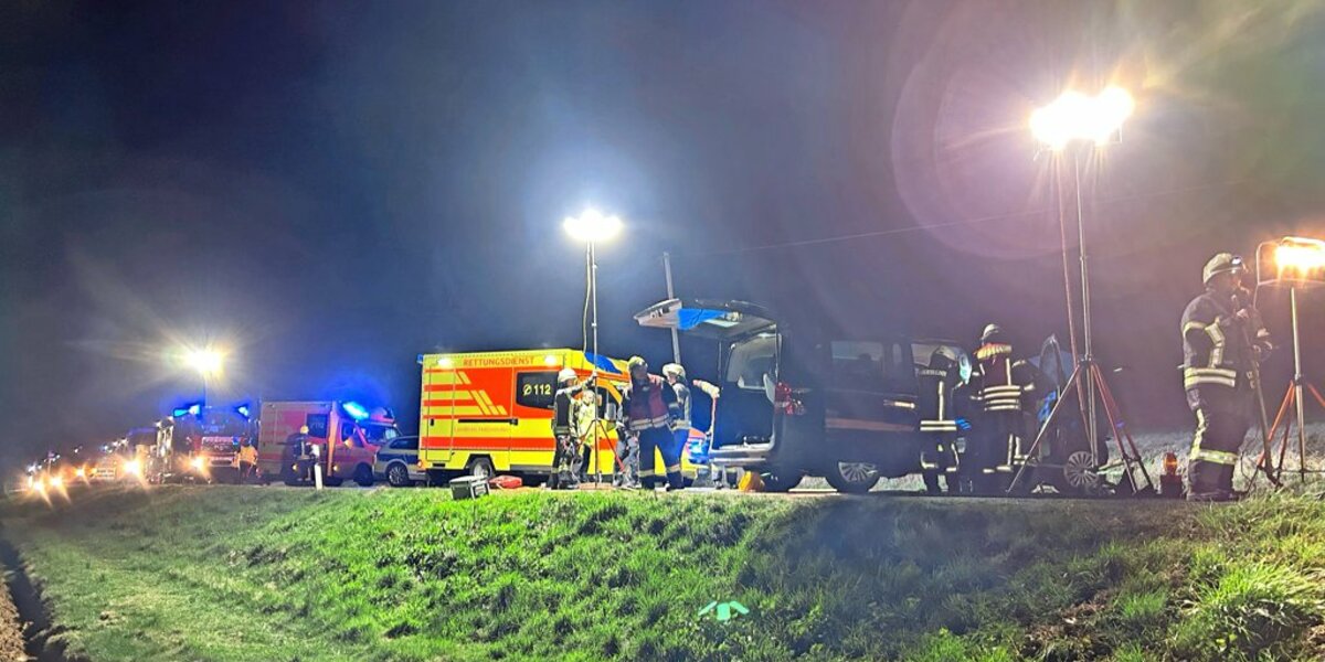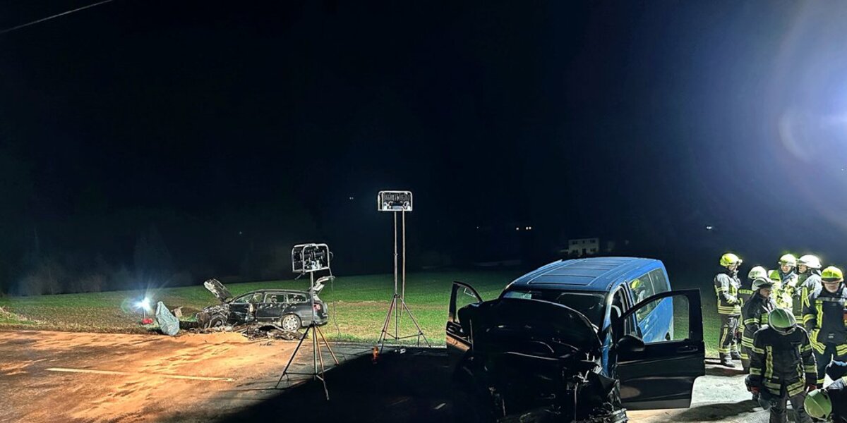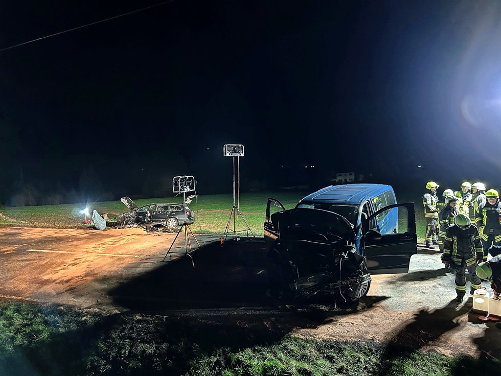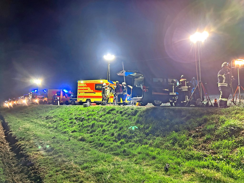 Um 20.51 Uhr wurden die beiden Feuerwehren dann erneut alarmiert – Grund: ein schwerer Verkehrsunfall, wiederum auf der L484. In einem Kurvenbereich war diesmal ein Auto in den Gegenverkehr geraten und frontal mit einem entgegenkommenden Auto zusammengeprallt. Durch den Zusammenstoß wurde ein Fahrzeug auf einen angrenzenden Acker geschleudert.