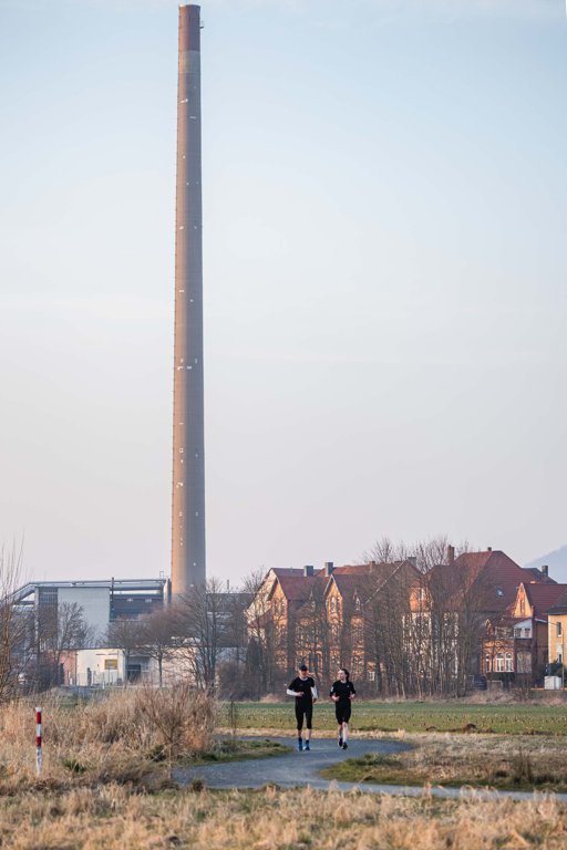 Wer schon etwas geübter ist, kann die Strecke auch verlängern. Start ist dann am Alten Wasserwerk in Eimsen. Von dort geht es auf geraden Asphaltstraßen über die Leinebrücke zwischen Wettensen und Godenau und dann an der Bahnlinie an Limmer und Limmerburg vorbei. In der Ferne ragt dann schon der Sappi-Schornstein auf, dem man sich mit jedem Schritt nähert. Der Weg führt immer geradeaus bis zum Hackelmasch-Parkplatz und dann über die Leinebrücke in den Auenpark. Der bildet die Schlussetappe des Laufs von etwa 8 Kilometern, Ziel ist am Hindenburg-Stadion.