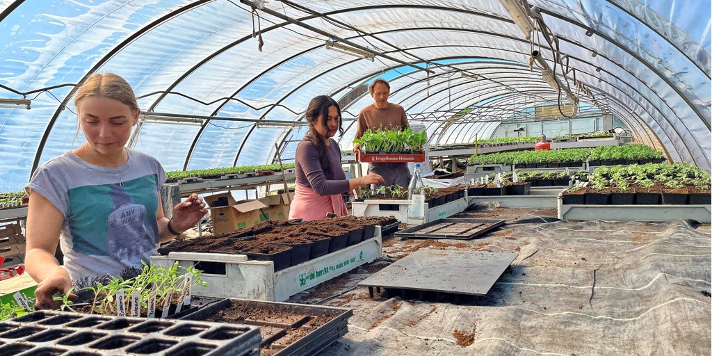 Everode - Marnie Ibenthal und Laura Buck stehen an einem Pflanztisch in einem Gewächshaus auf…