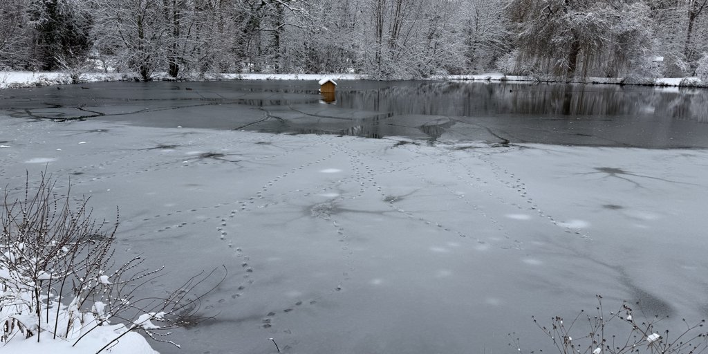 Die Eisdecke auf Stiefels Teich trägt maximal Enten, die dort schon ihre Spuren hinterlassen haben. Foto: Madlin Trümper